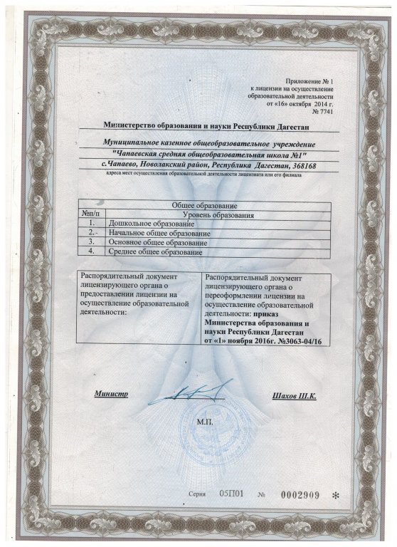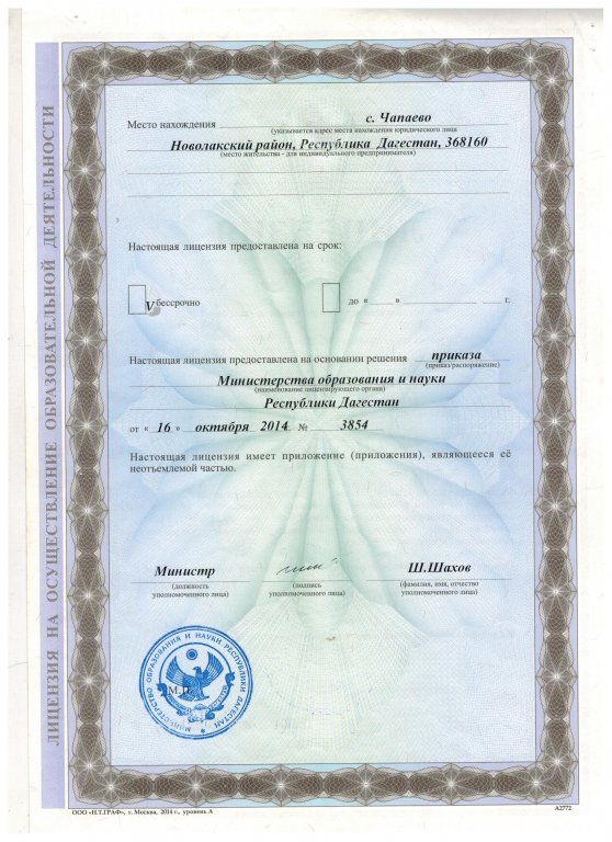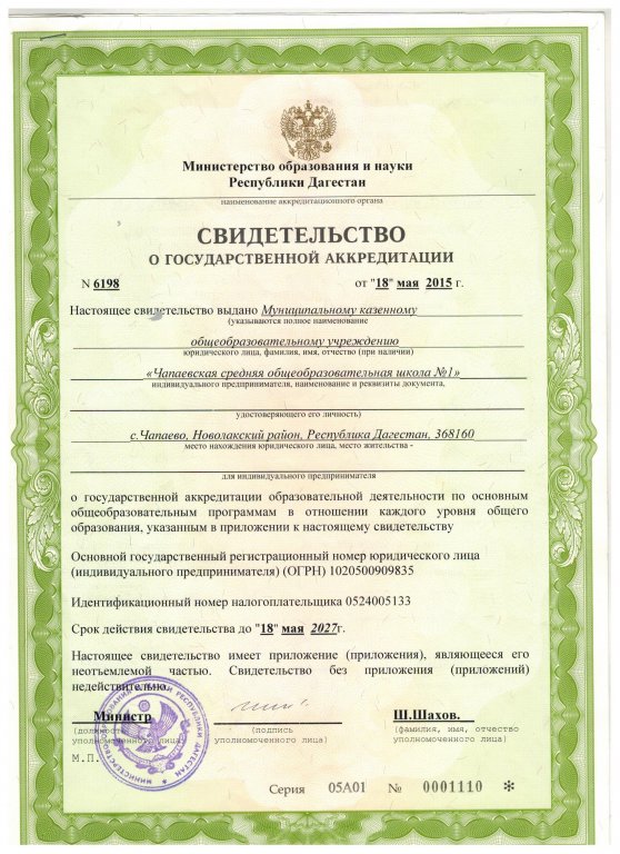 | Адрес местонахождения образовательной организации* | Республика Дагестан, Новолакский район с.Чапаево ул.Одиннадцатая 7/8 368160 |